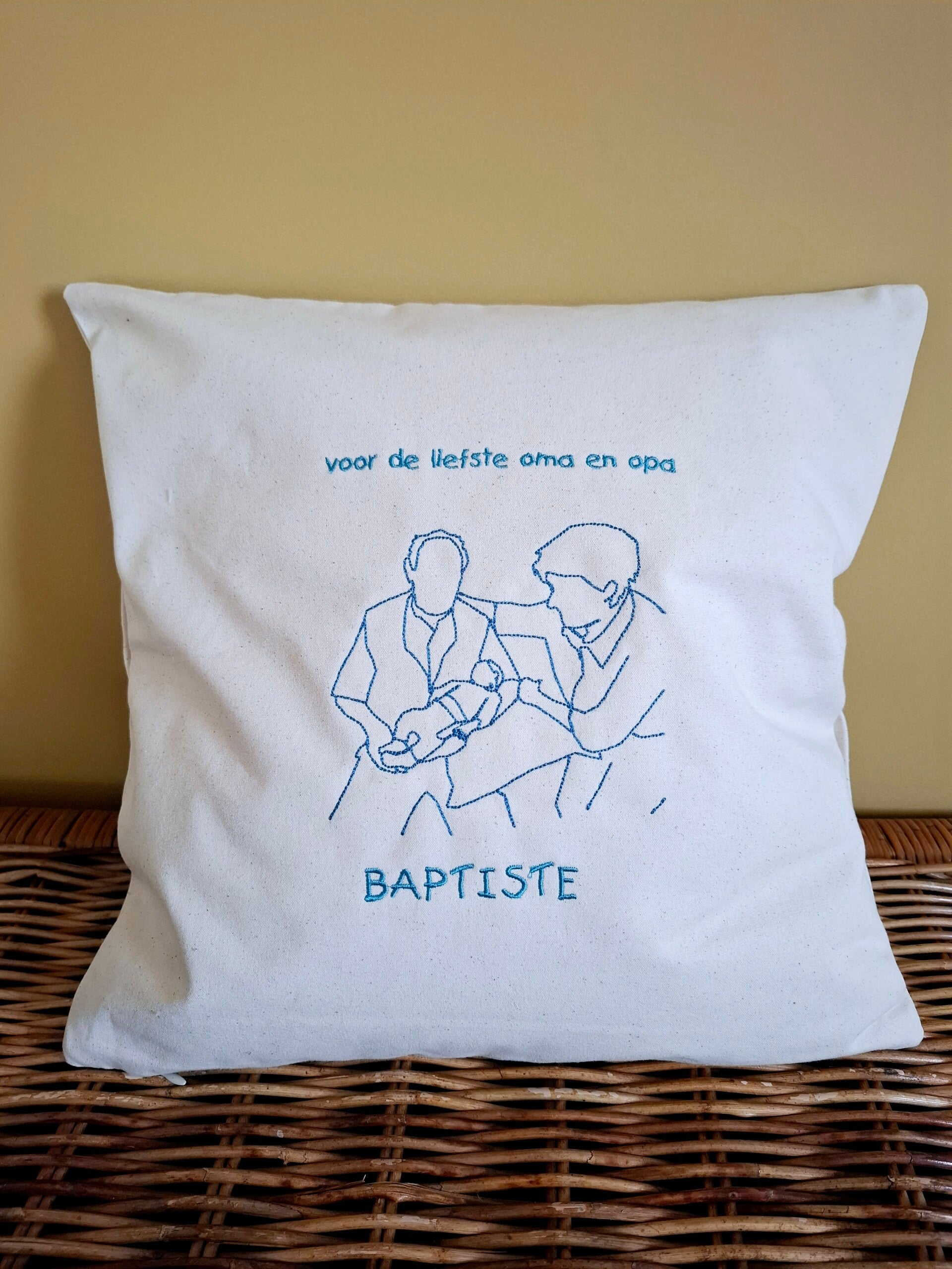 Een kussenhoes kan gepersonaliseerd worden naar jouw wensen. Lijntekening met foto of tekstje.