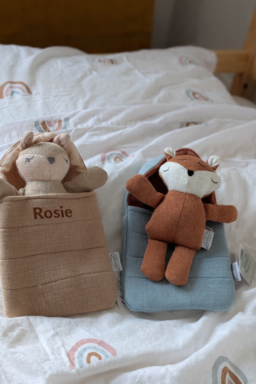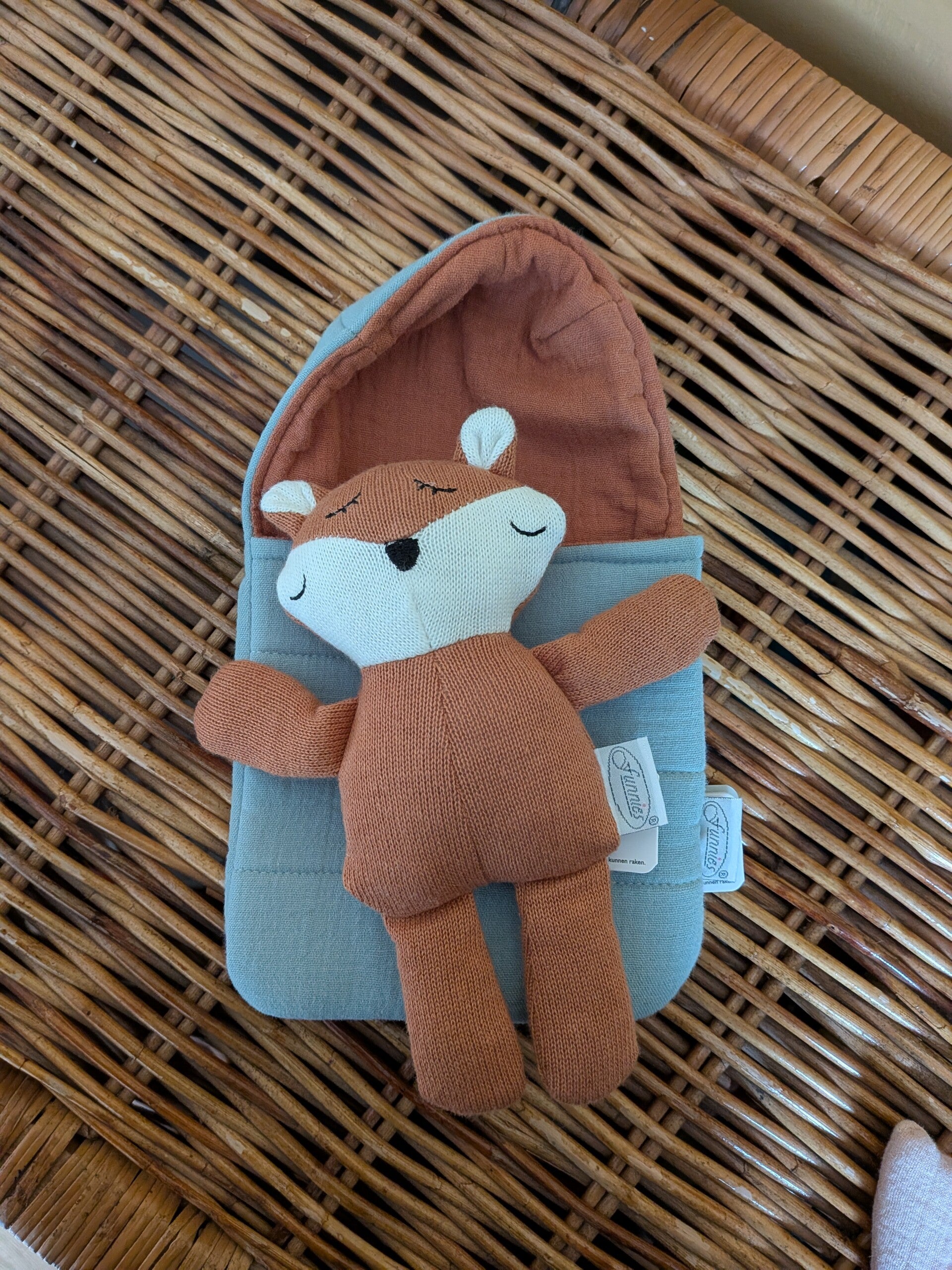 Afmetingen knuffeltje: ± 15 x 19cm. – Slaapzakje: ± 14 x 23cm